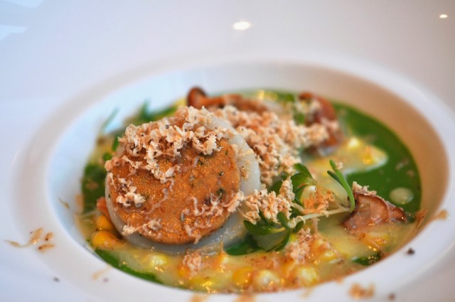 Confit of Georges Bank Sea Scallop chanterelle mushrooms panade, corn kernels, brocolli veloute, seasoned foie gras pastrami