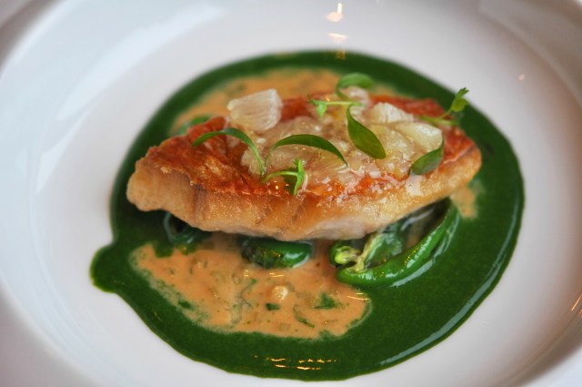 Fillet de Rouget Barbet grilled shishito peppers, lemon condiment, cornichon jus, basil dressing