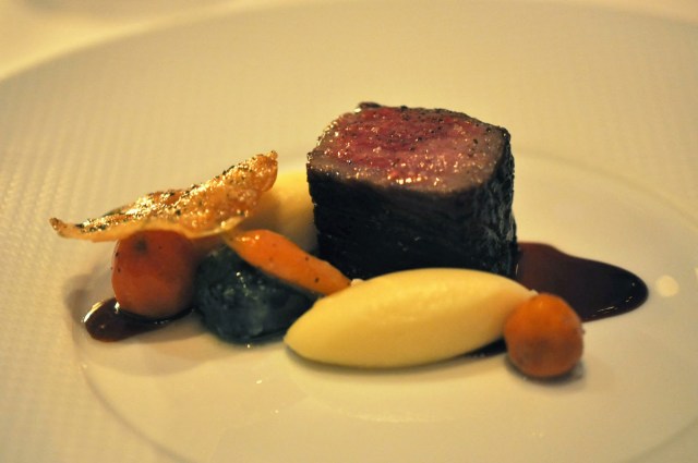 Herb Roasted Miyazaki Japanese Wagyu pommes puree, glazed carrots, arrowleaf spinach, sauce bordelaise