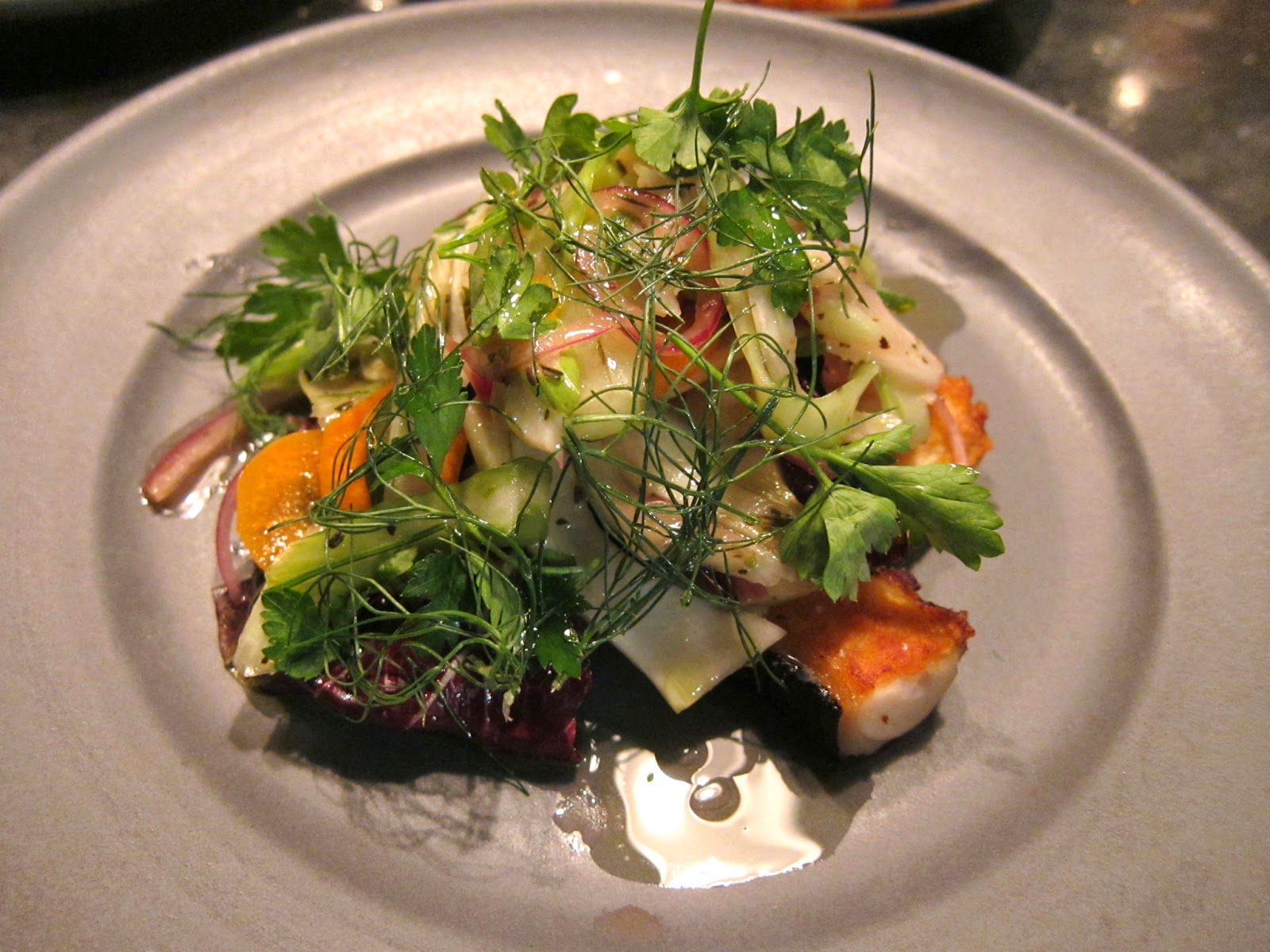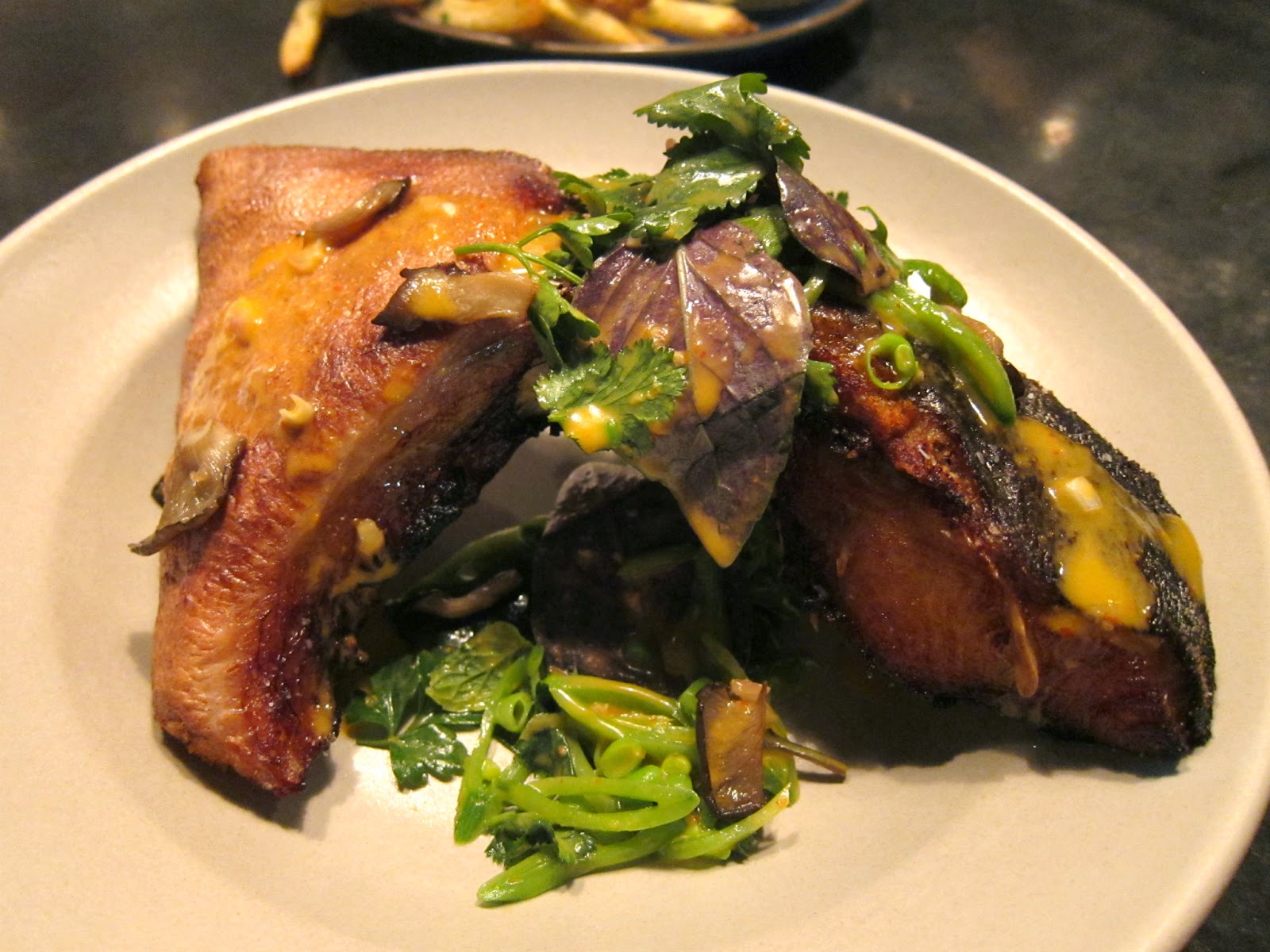 Kampachi Collar sugar snap, herbs, chili vinaigrette, oyster mushroom