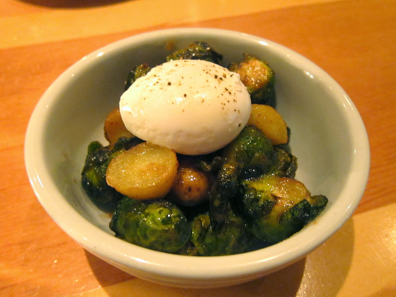Brussels Sprouts Hash twice cooked brussels, yukon golds, bacon vinaigrette, poached egg