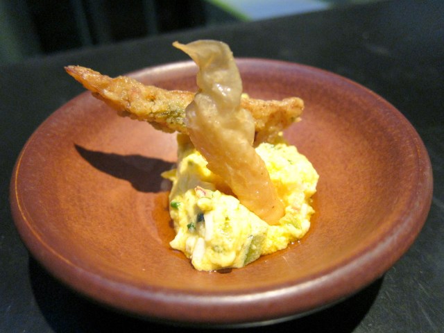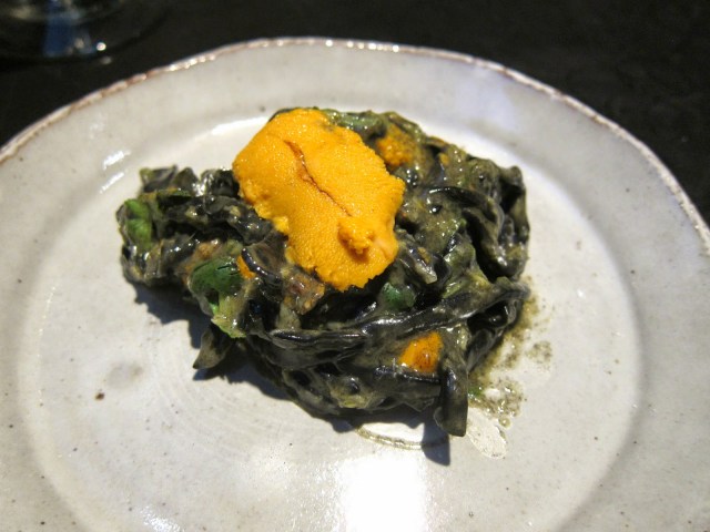 Shirley really wanted to make an uni pasta that had a lot of uni flavors and she was successful. She really turned up the Asian-ness by incorporating ginger and scallion into a sort of pesto. First of all the noodles were amazing. Soft, yet chewy, and with a good amount of texture to carry the sauce. The sauce was luscious without being greasy or overwhelming. My only complaint was that the ginger was a bit too overpowering and distracting. I’d still put this on the top of my short uni pasta list.