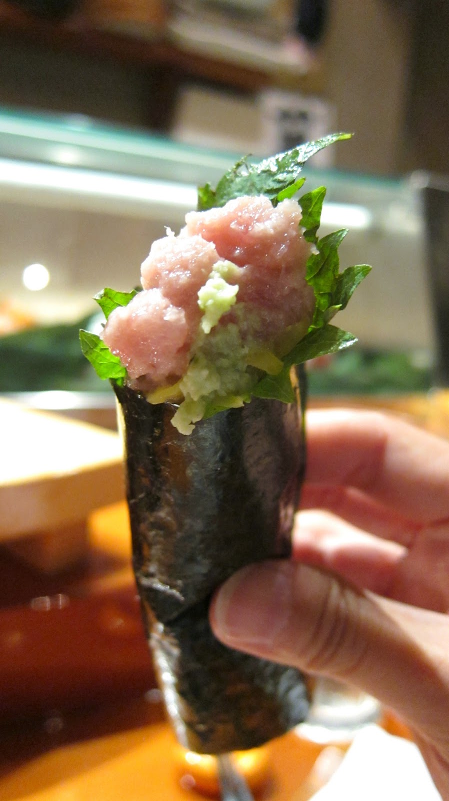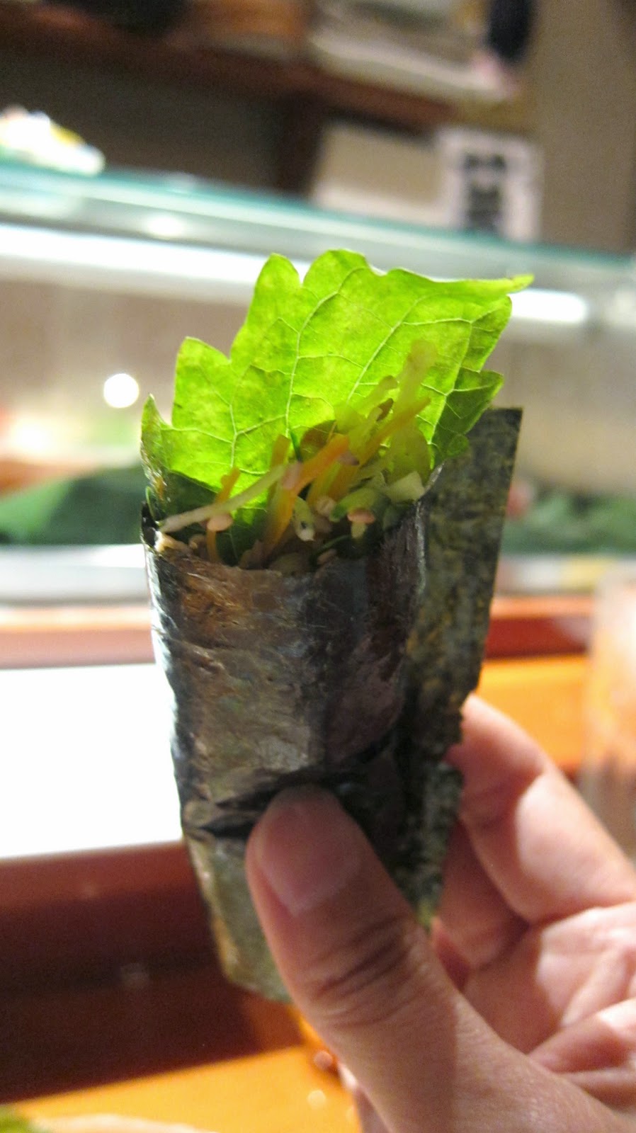 I love handrolls, but the shiso leaf or whatever that green thing here was offputting as shiso usually is for me.