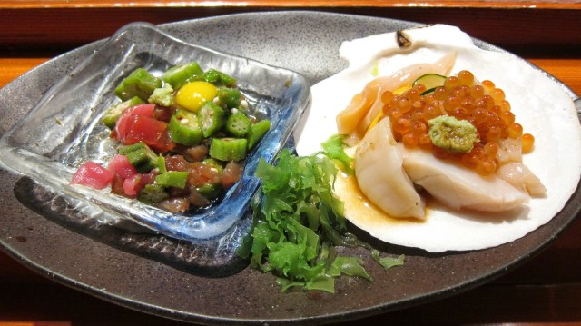 I never had raw baby squid like this before. I guess squid has some innards and guts that area usually removed when you buy them in the store? I’m actually not totally sure, but something was different tasting about it and it felt like I was eating squid guts but it was so delicious! Not off or fishy tasting. It was also lightly dressed in some ponzu. Wow, I couldn’t believe squid could taste this way.