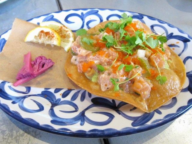 Salmon Tostada avocado, jicama, pickled jalapeño, grapefruit, roe
