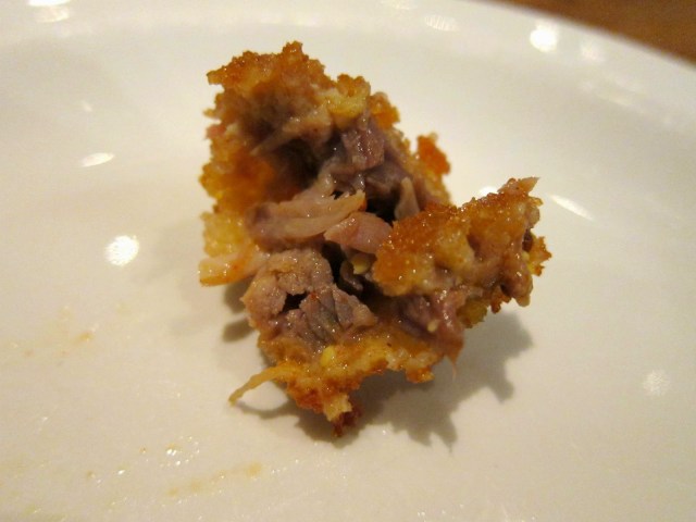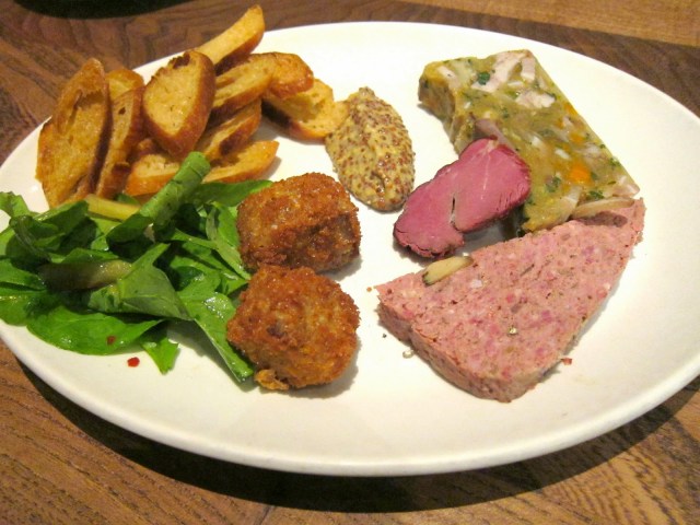I rarely meet a charcuterie platter I don’t like, but aside from the crispy trotter which was like a meat tater tot, everything else was meh. In fact, the headcheese had a terrible formaldehyde smell/taste to it. It was soooo unappetizing. The Pouter didn’t agree with me, but I felt it wasn’t even subtle. It was like here are some pig parts that taste like cadavers. Gross.
