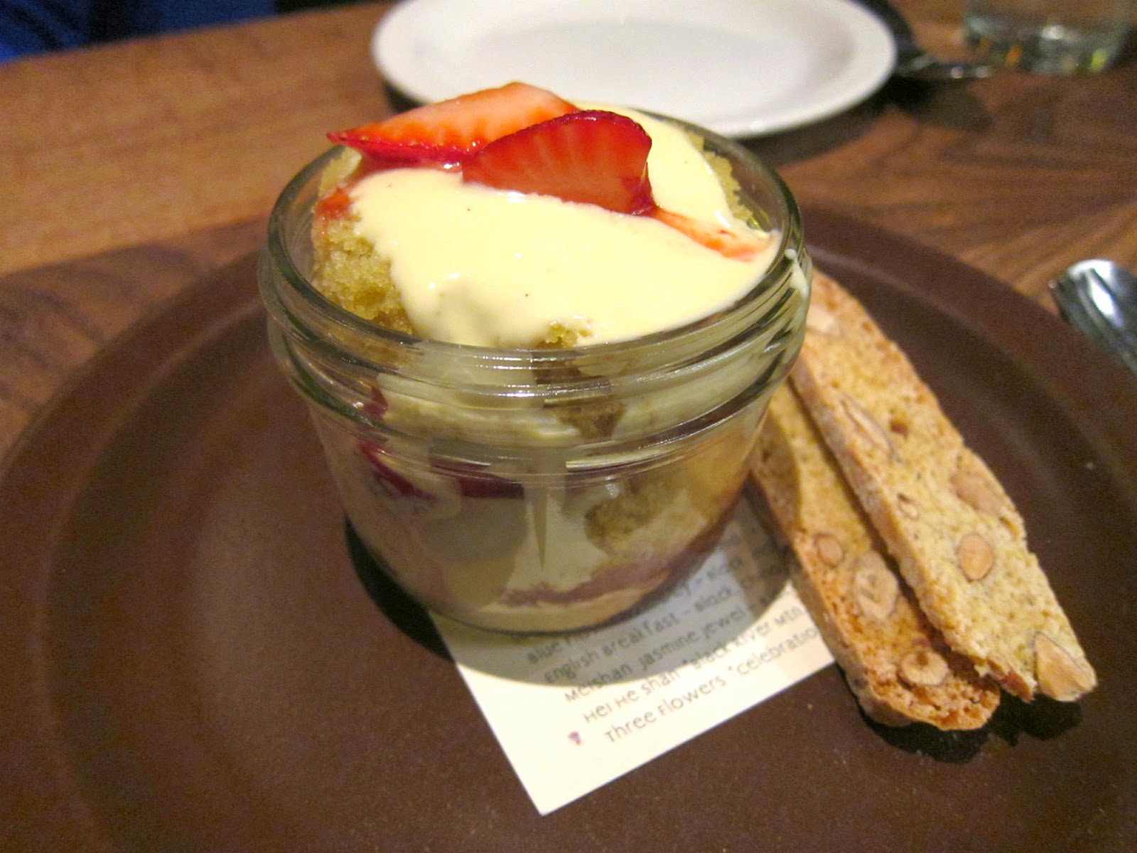 Olive Oil Cake Trifle oloroso crème, strawberries, almond biscotti