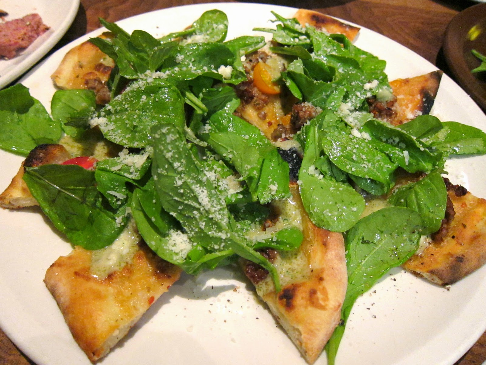 Flatbread of Spicy Fennel Sausage cherry tomatoes, arugula, basil