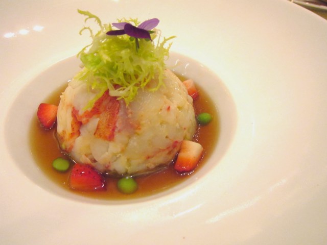 This dish was served cold, which was refreshing. The lobster was all sweet suculent meaty tail meat. No corners cut here, thanks Chef Rostang. Beneath the lobster was a sweet pea mash. It actually got a bit tiresome to eat. I think this dish would have been better at half the portion or maybe if something else zingy were added to the mix. I’m not sure if I saw how the strawberries fit in here. It was the wrong kind of zing I wanted.
