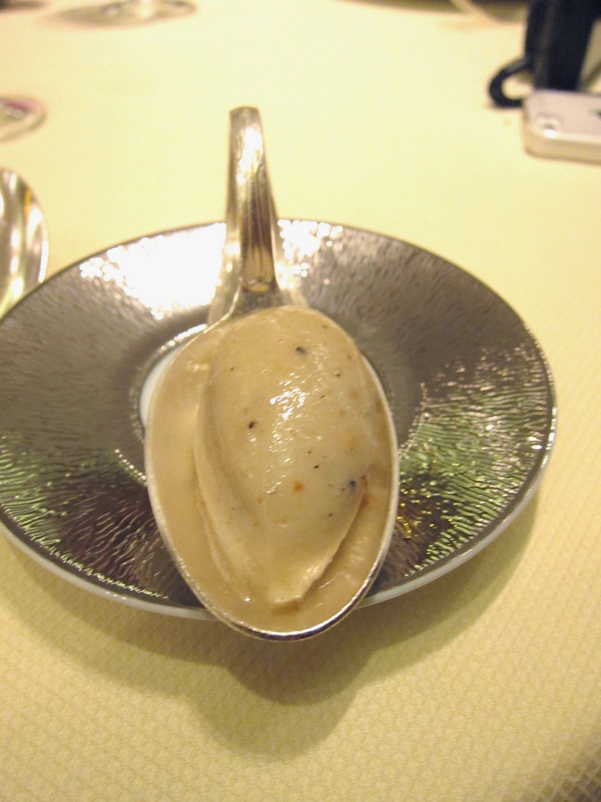 This dish was served cold, which was refreshing. The lobster was all sweet suculent meaty tail meat. No corners cut here, thanks Chef Rostang. Beneath the lobster was a sweet pea mash. It actually got a bit tiresome to eat. I think this dish would have been better at half the portion or maybe if something else zingy were added to the mix. I’m not sure if I saw how the strawberries fit in here. It was the wrong kind of zing I wanted.