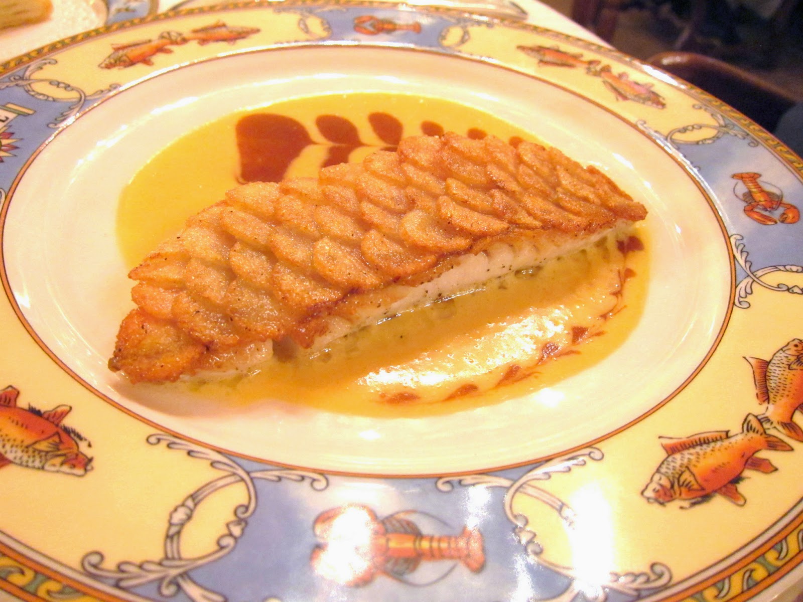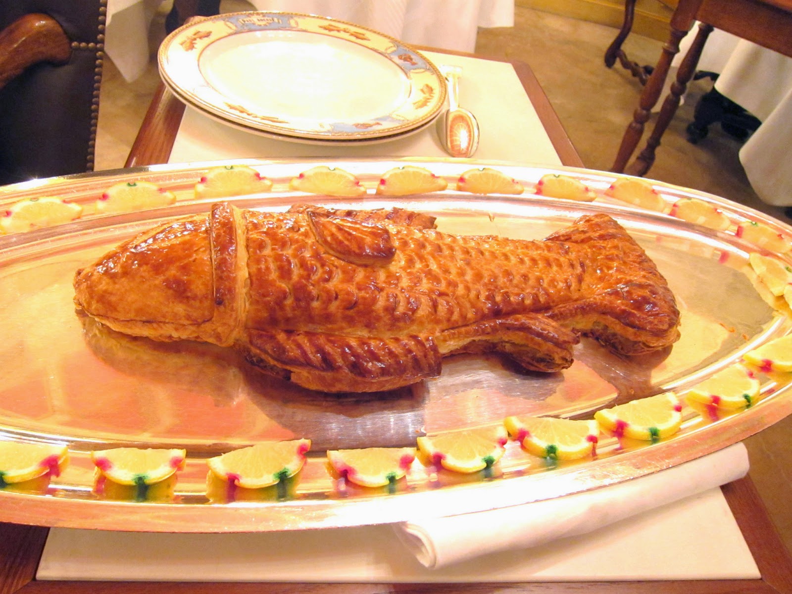 Anthony Bourdain had a more detailed description. The whole fish was stuffed with a lobster mousse, chervil, taragon and then wrapped in a flaky puff pastry. A tomato bernaise sauce was served tableside, AS. IT. ALWAYS IS.