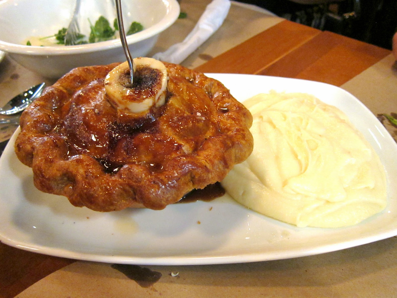 Ok, it’s time to write home to mom about this one. Wait, mom was sitting right next to me. Scratch that. But damn, you have to get this pie. The crust was incredibly buttery and flakey. The filling was chunks of tender beef cheeks in a dark brown gravy. It was kinda salty, but that just allowed me to drink more wine. It would definitely be difficult to eat this with just one other person. It’s pretty darn heavy. Honestly, the marrow was just excessive, but makes for a cool presentation.