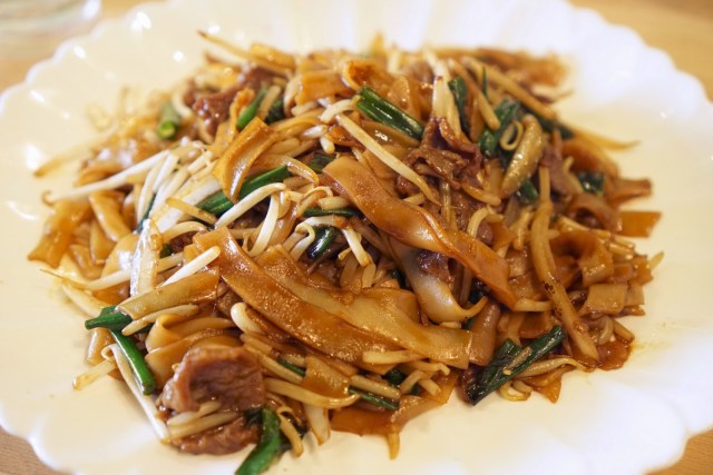 Beef Chow Fun green onions, bean sprouts, large rice noodles