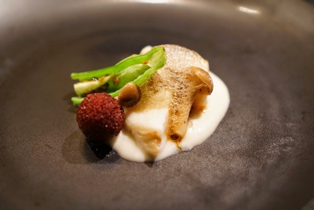 Trumpet Fish mushroom, white sauce, mountain peach, ponzu foam