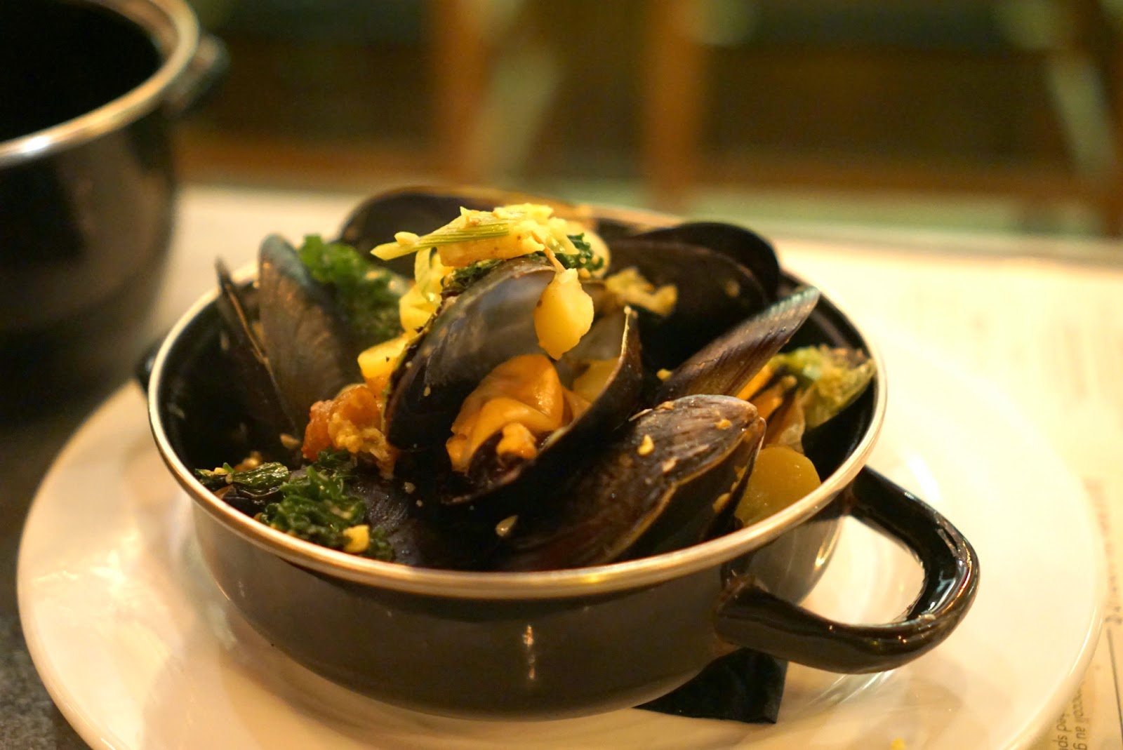 Moules Molina saffron broth, creamed leeks, potato, kale, pancetta