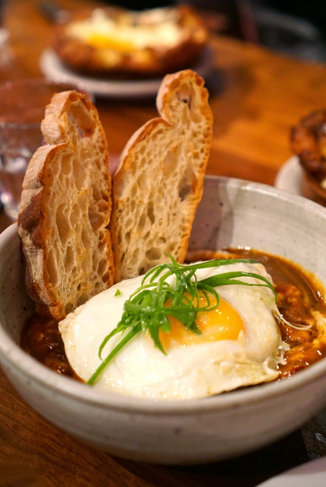 Oxtail Hash gruyere horseradish creme fraiche, fried egg