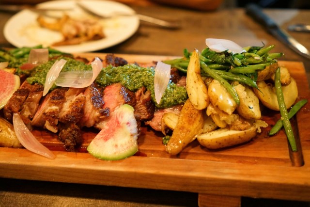 Can’t Hang and Fishing Zebra Man weren’t all that excited for vegetables, but I like my greens for my digestive health. Everyone was pleasantly surprised at the tastiness factor going on here. I wouldn’t quite give the duck a resounding A+ but it was good enough to go with everything else. Overall, nice dish with a lovely presentation. Everything served off a wooden board just eats better, don’t you think?