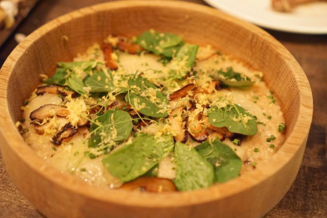I did not grow up eating oatmeal, so it’s a nasty texture to me and I can’t understand how people eat that goop for breakfast. Here, they turned breakfast into dinner making a “risotto” out of steel cut oats. I thought that was pretty ingenious and I’ve not seen it done before. Some of my dining companions thought the dish was weird and preferred eating oatmeal the normal way. To each, his/her own.