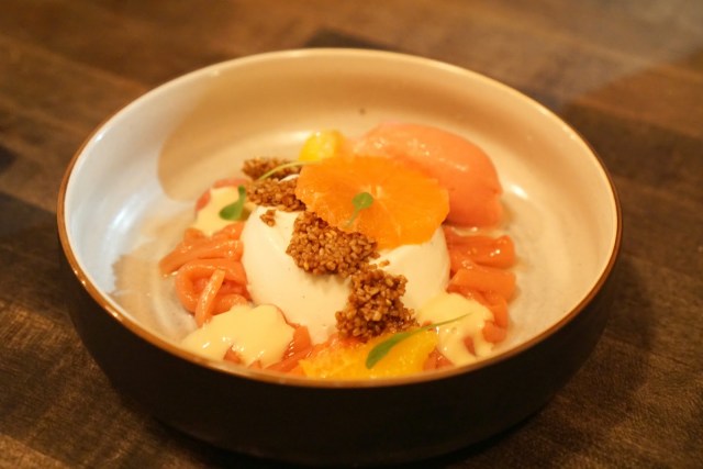 I wanted to like this dish, but the rhubarb component (the squiggly little pink things surrounding the white center) had an odd texture. The panna cotta was definitely gingery. I liked the housemade granola quite a bit. There were definitely a lot of components thrown together here, but I’m not quite sure they all married well.