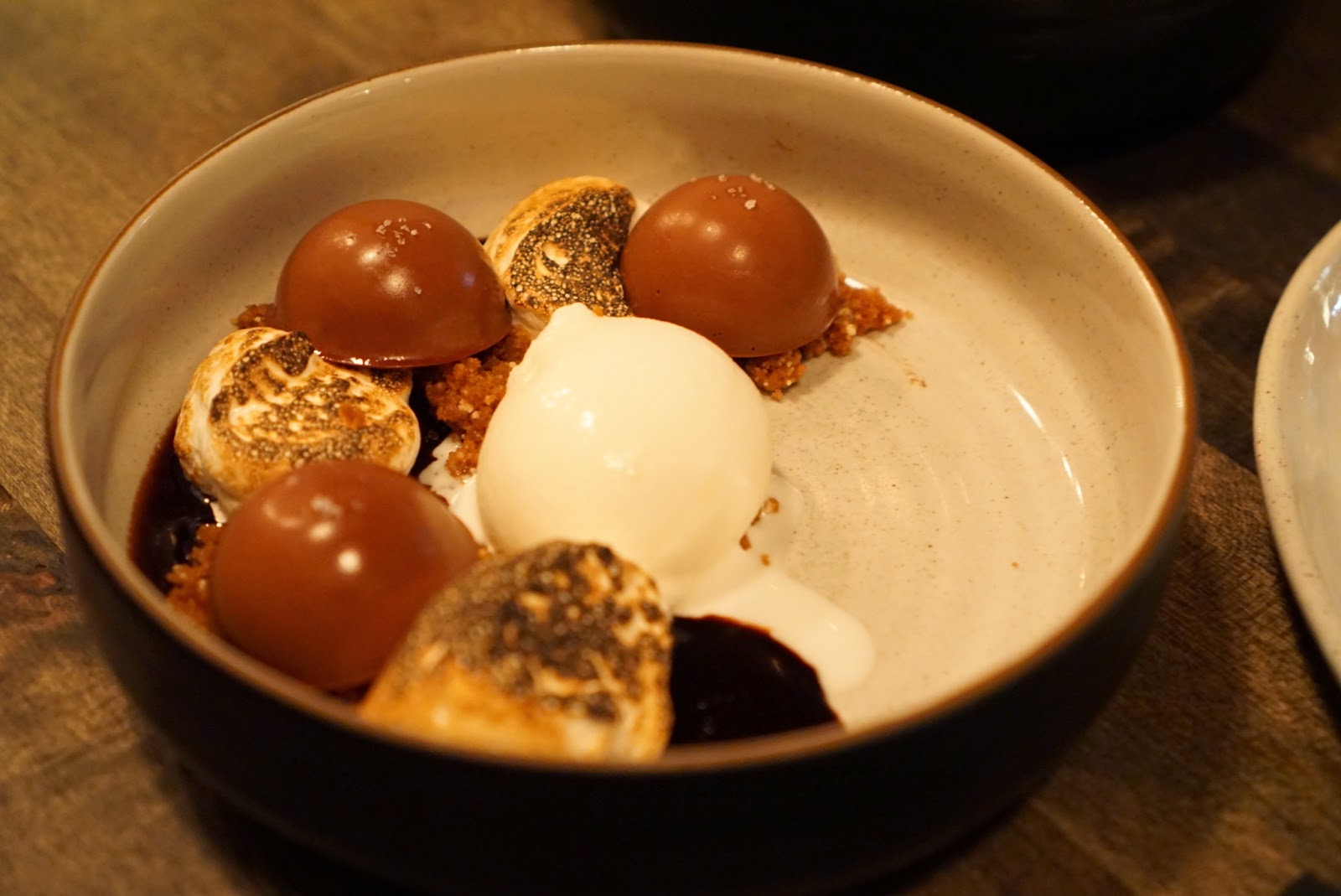 Deconstructed smores, pretty self explanatory. The chocolate hemispheres were a bit too dense and I think chemically altered to a particular texture and to maintain their shape. I think that detracted for the purity of just being chocolate. Still good overall.