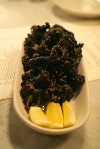 I have concluded that squid ink anything is just a sham, a gimmick. Squid ink does not add any significantly notable flavor. It adds a strikingly black color, but my tongue lacks the ability to taste color. Stupid tongue! There were still light and crispy, not overly battered.