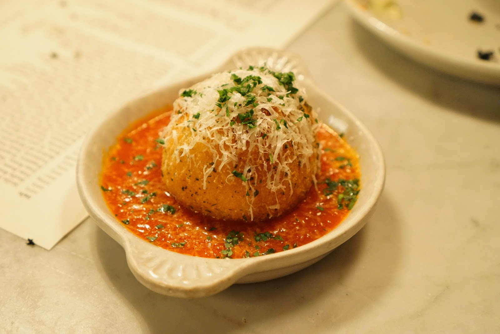 Rice Ball meat sauce, peas, ricotta, mozzarella, tomato sauce
