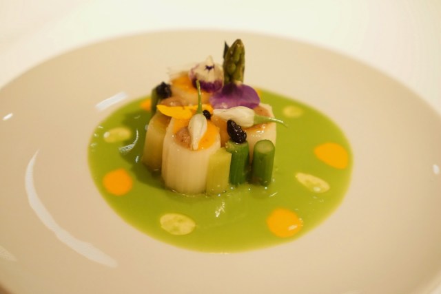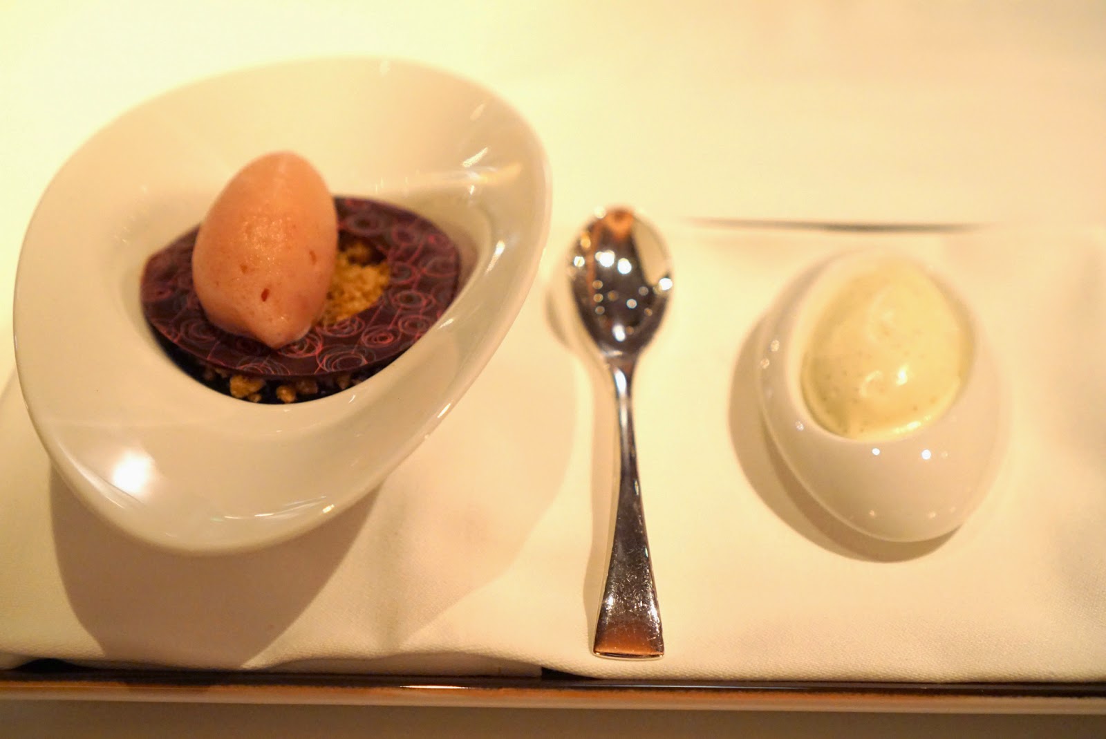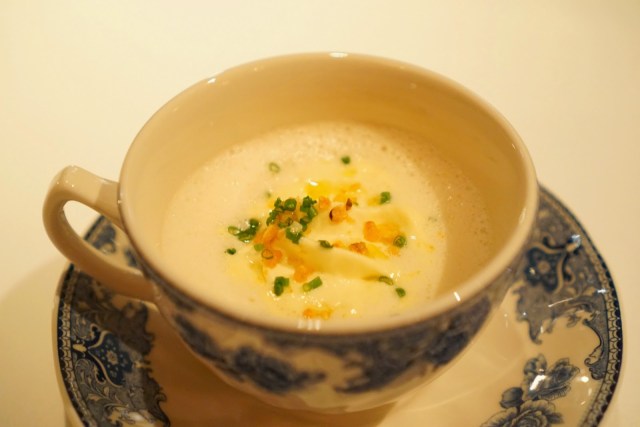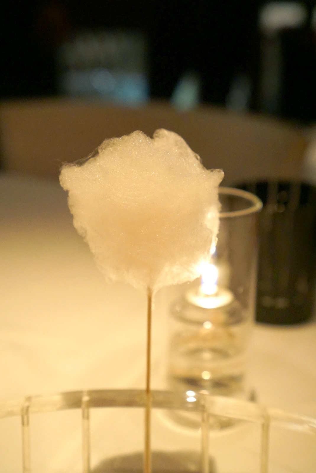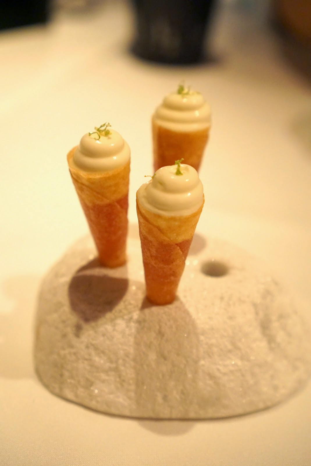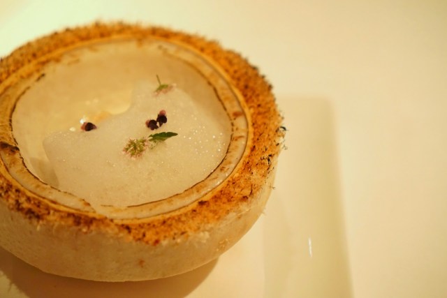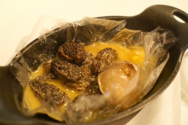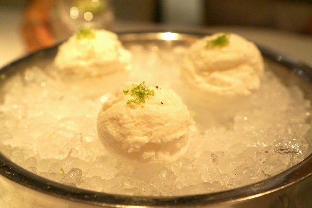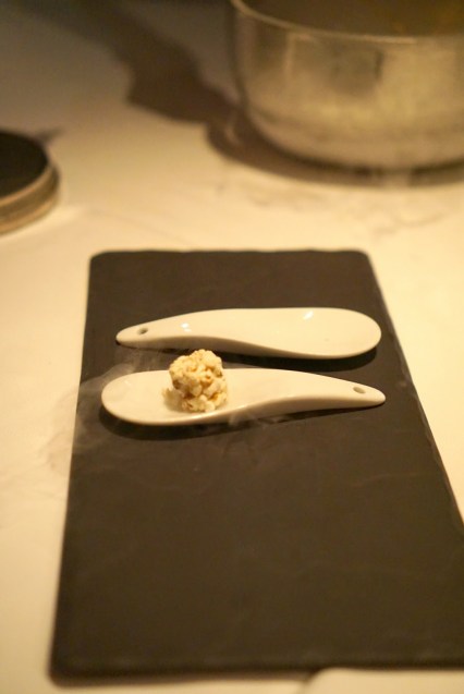 We started off with the most interesting aperitif in the form of these little white puffs. They looked like scoops of ice cream, but they were these foamy maybe spongey balls of alcohol. There was citrus, tartness, and definitely some smokiness going on here. A for originality, but what an odd texture.