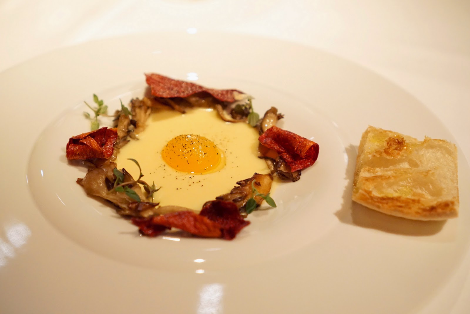 Oh man, the tastiness carried over and was magnified in this dish. What looked like a perfect sunny side up egg was actually an egg yolk surrounded by a luscious bacon rich cream to mimic the egg white. The pepper chips and bit of bread served as vehicles to sop up all the deliciousness.