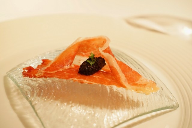 Jamon iberico has to be the pinnacle achievement in cured meat history. If you’ve never had it, you HAVE to try it. Jamon iberico comes from black Iberican pigs that are allowed to roam free in western and southwestern Spain to feed on a diet of mostly acorns. It’s really hard to describe the flavor of the ham. I would use words like strong, nutty, umami, distinct. Triple T doesn’t like the flavor, but she’s not a very adventurous eater. I thought this was one of the best bites of the night. Surprisingly the caviar was not excessively salty so overall the combination was delicious.