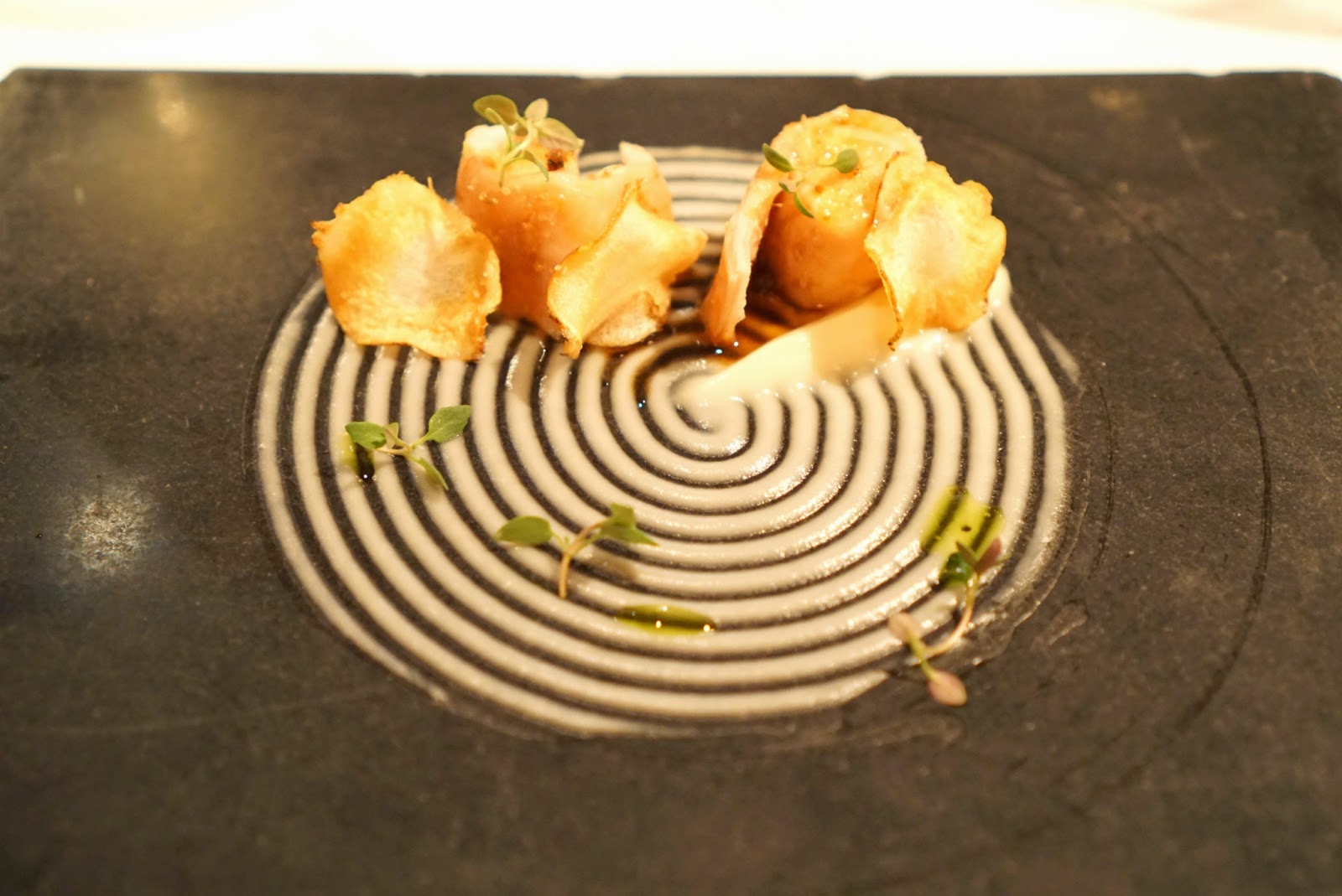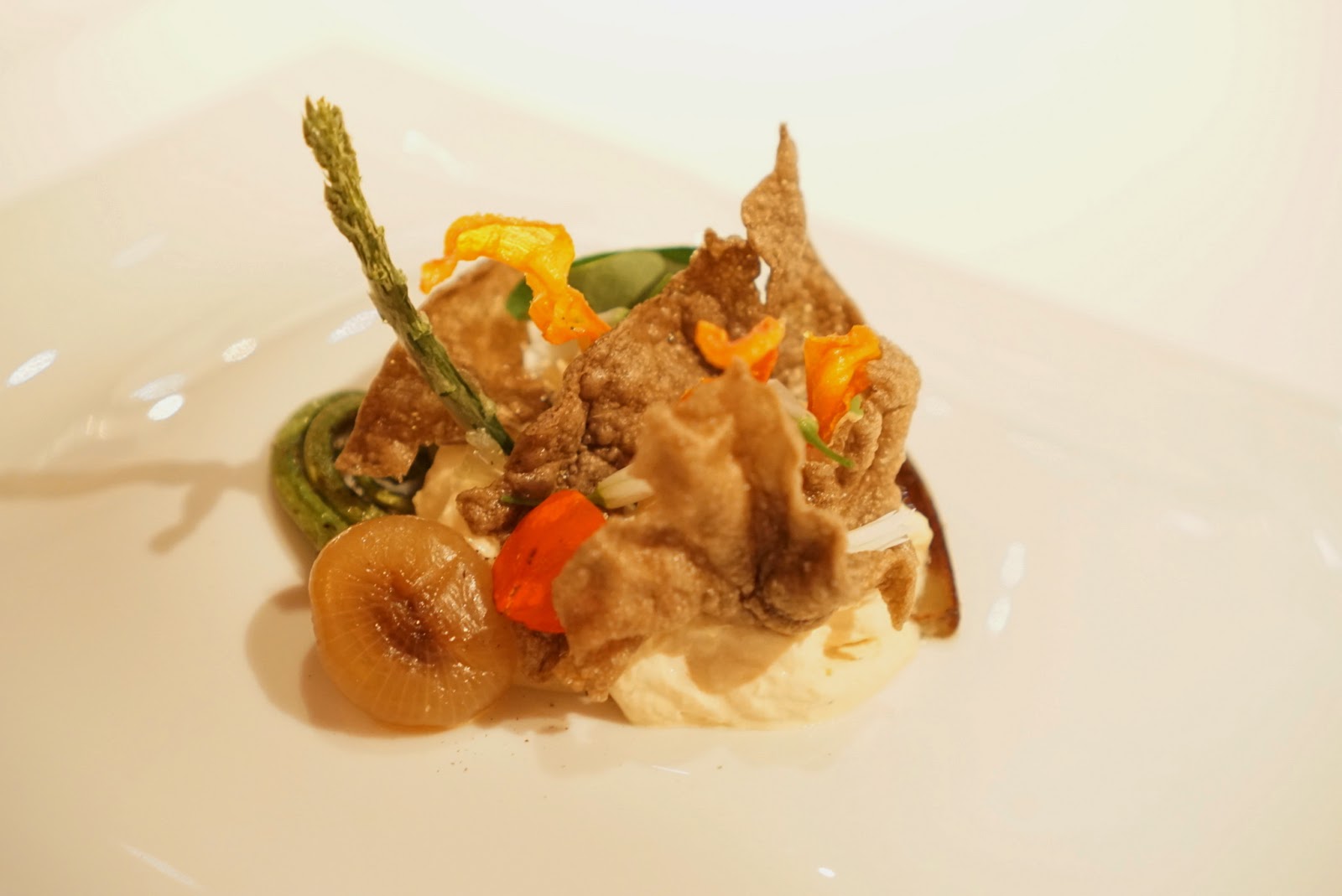 More espuma! Soo good!!! This dish was oozing with umami-ness. Similarly with the popcorn chip, the potato and carrot crisps were a great vehicle to get as much porcini espuma into ma pie hole! We all thought the fennel hedge wheel was a little weird.