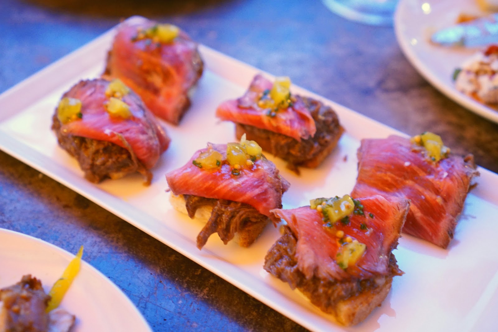 Montadito de Costilla shortrib confit and crudo, mustard seed, toast