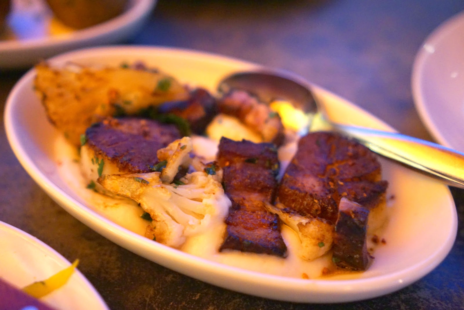Mar y Montaña seared pork belly, sea scallops, cauliflower crema