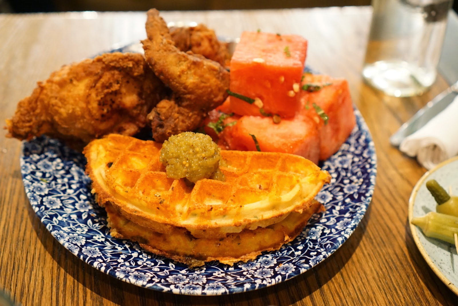 Chicken ‘n’ Watermelon ‘n’ Waffles ‘old school fried chicken’, honey hot sauce, chilled spiced watermelon, cheddar cheese chow chow waffle, bourbon maple syrup