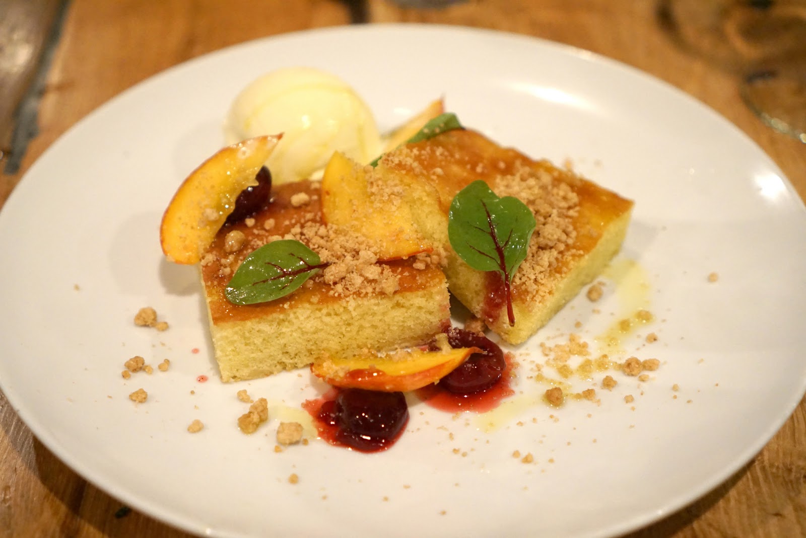 This was a more interesting and tasty dessert. Rock Dweller seemed to appreciate the subtle olive oil taste, but I’ve had stronger tasting desserts. If you didn’t pay attention you probably wouldn’t know there was olive oil here. The peaches made the dish seasonal, while the bit of ice cream made it traditional. You can never go wrong with a la mode!