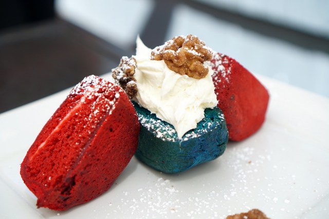 Red & Blue Velvet Pancakes cream cheese spread, whipped cream, candied walnuts (half order)