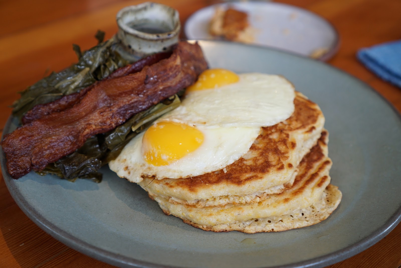 I saw corncakes and had to have them. I just find them to be more substantial than regular pancakes and I love that extra texture from cornmeal. The bacon was thick and crispy. The braised greens were unremarkable.