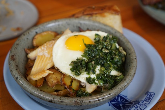 Potato Plate baked egg, house smoked trout, salsa verde, toast
