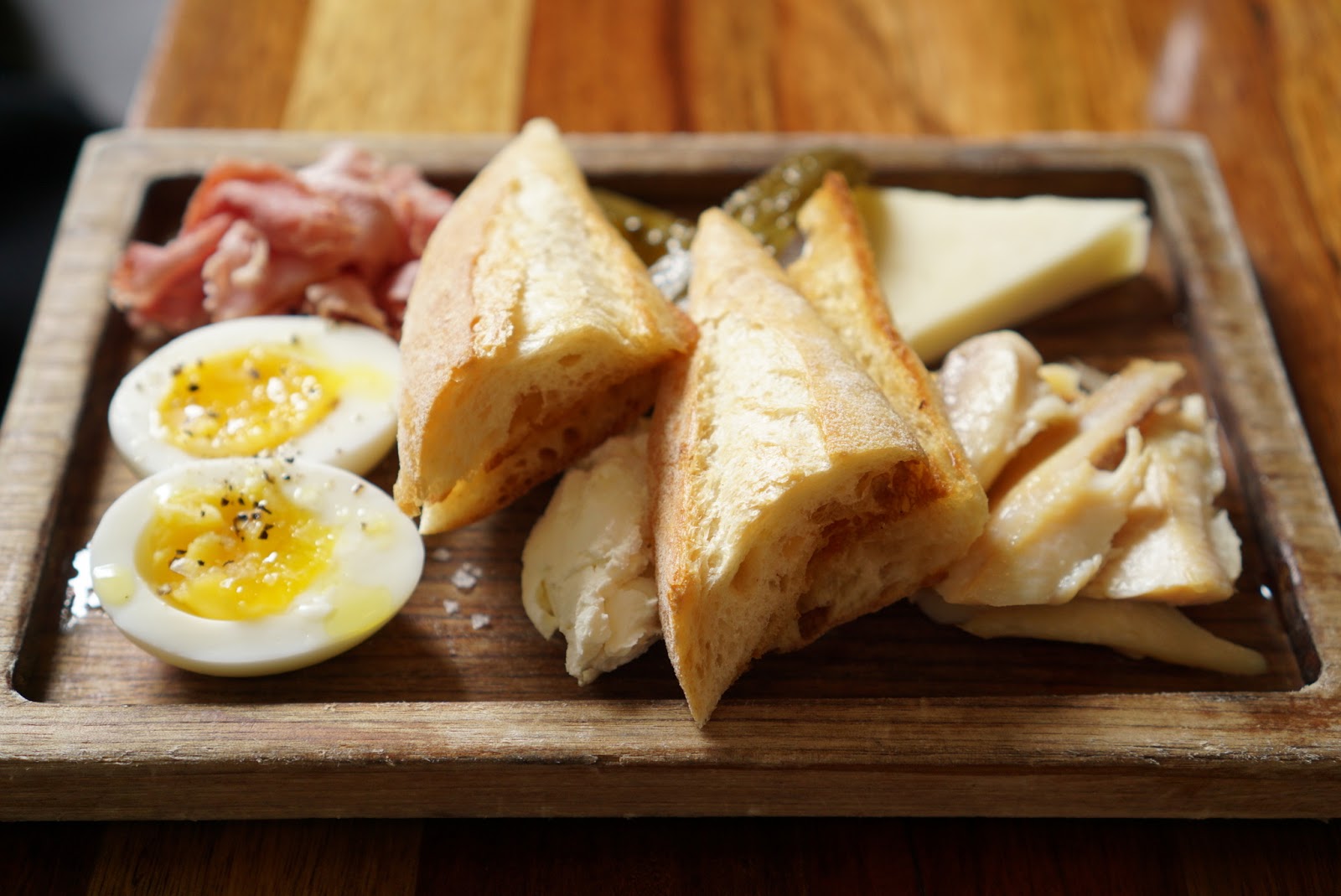Brunch Board sweetheart ham, soft boiled egg, smoked trout, dill pickle, cream cheese, goat cheddar, toasted baguette
