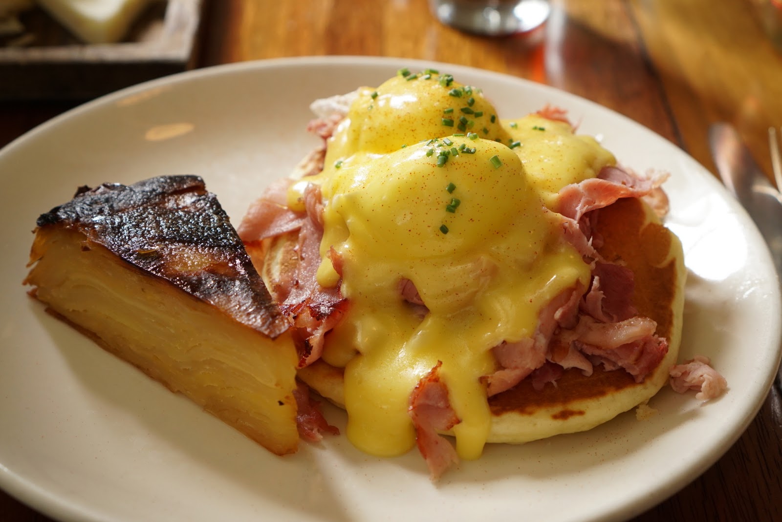 The Benedicts hot cakes, sweetheart ham, poached eggs, hollandaise, potatoesSo my choice had it all. I swapped out the traditional English muffin for pancakes. Oh they were so light, fluffy, and not sweet. I missed that bit of sweetness, so asked for a side of maple syrup. I actually loved the contrast of salty hollandaise and sweet syrup. The perfectly running yolks added a luscious richness. That pie slice looking thing was like a potato pavé, so layers of thinly sliced potatoes baked up with plenty of butter. It was a definitely a break from the traditional hash browns or breakfast potatoes. There was some odd flavor there that I couldn’t pin point, that made me want some crispy hash browns.