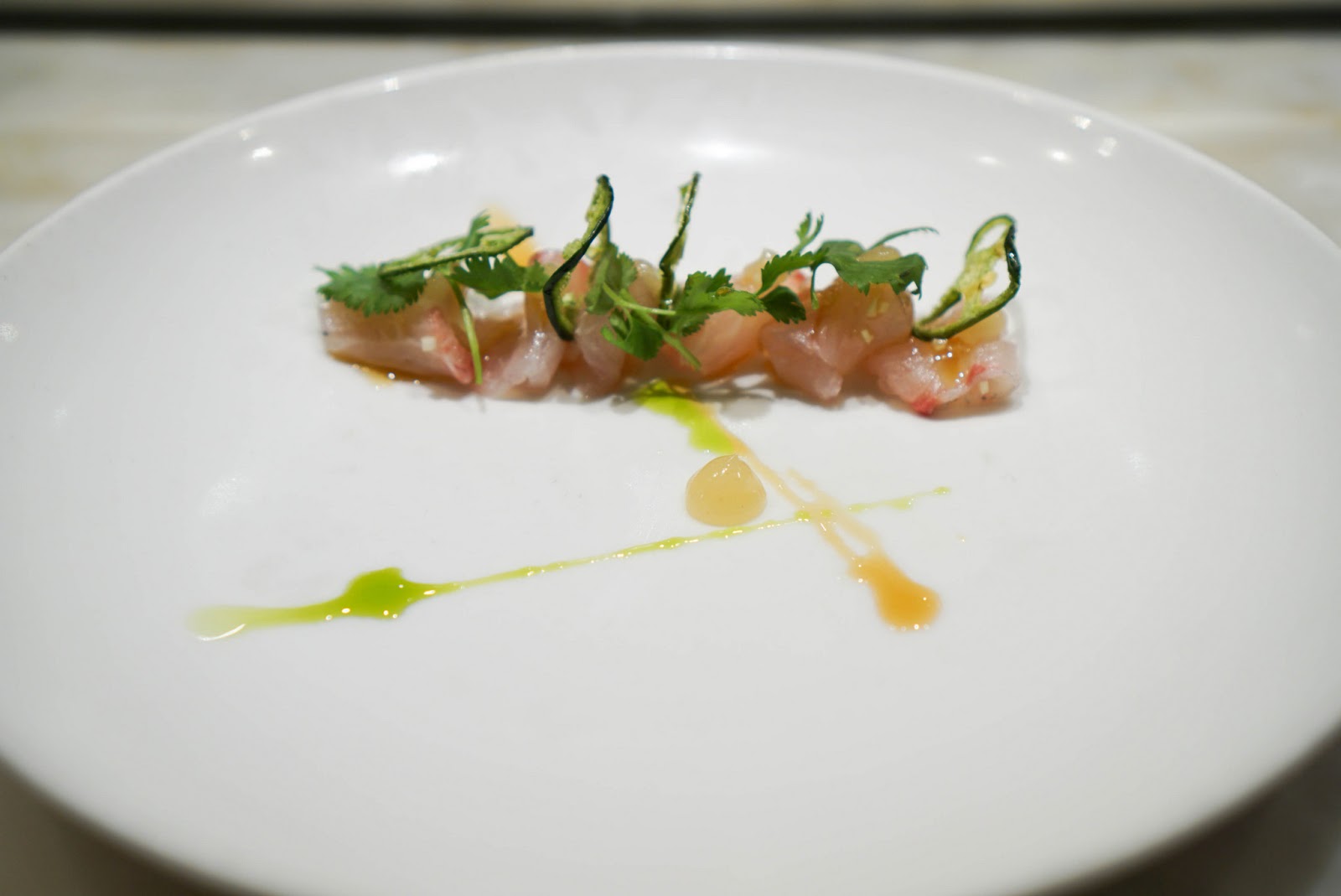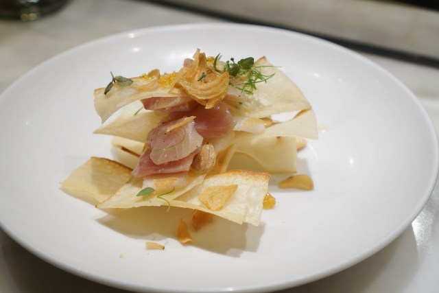 Kanpachi Crudo amberjack, truffle, jalapeño, yuzu dashiI enjoyed this much more than the last crudo dish. The flavors were bright. The truffle wasn’t overpowering. That little jalapeño chip was pretty spicy if you got a slice with just one seed. Bair Hugger Deluxe still liked his machi cure.