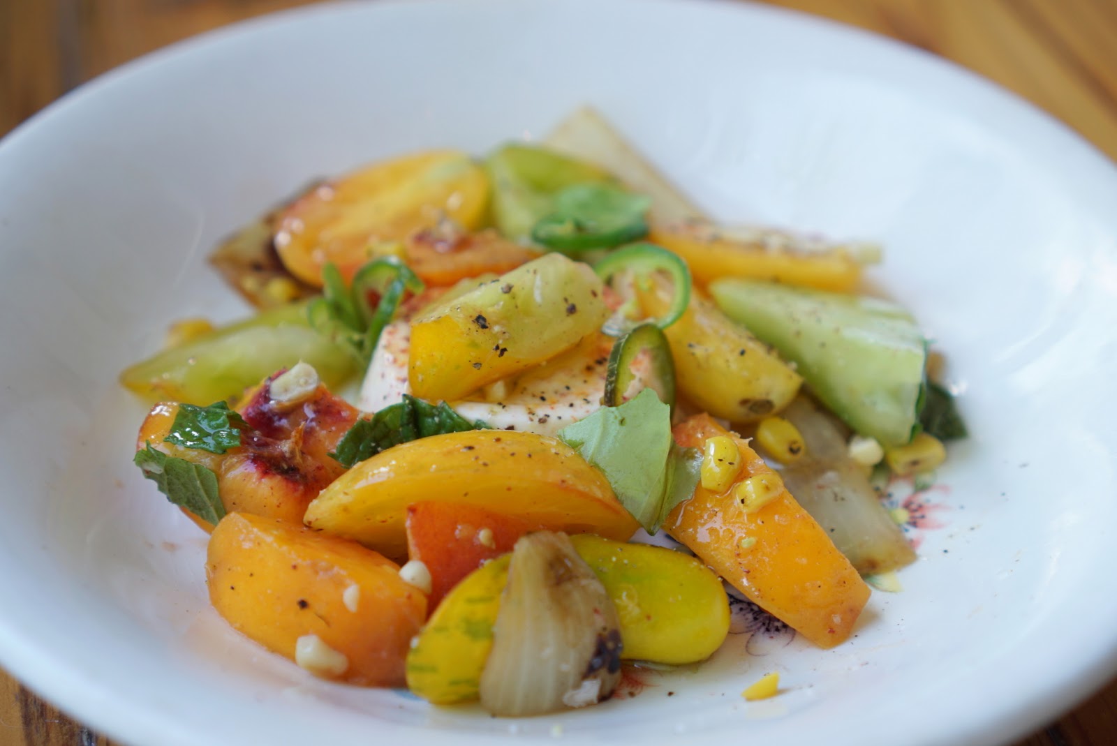Tomato Salad corn cream, peaches, jalapeño