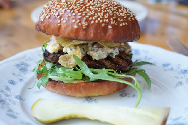 A good burger, with crunchy potato chips for texture and a cheesy bacony spread.