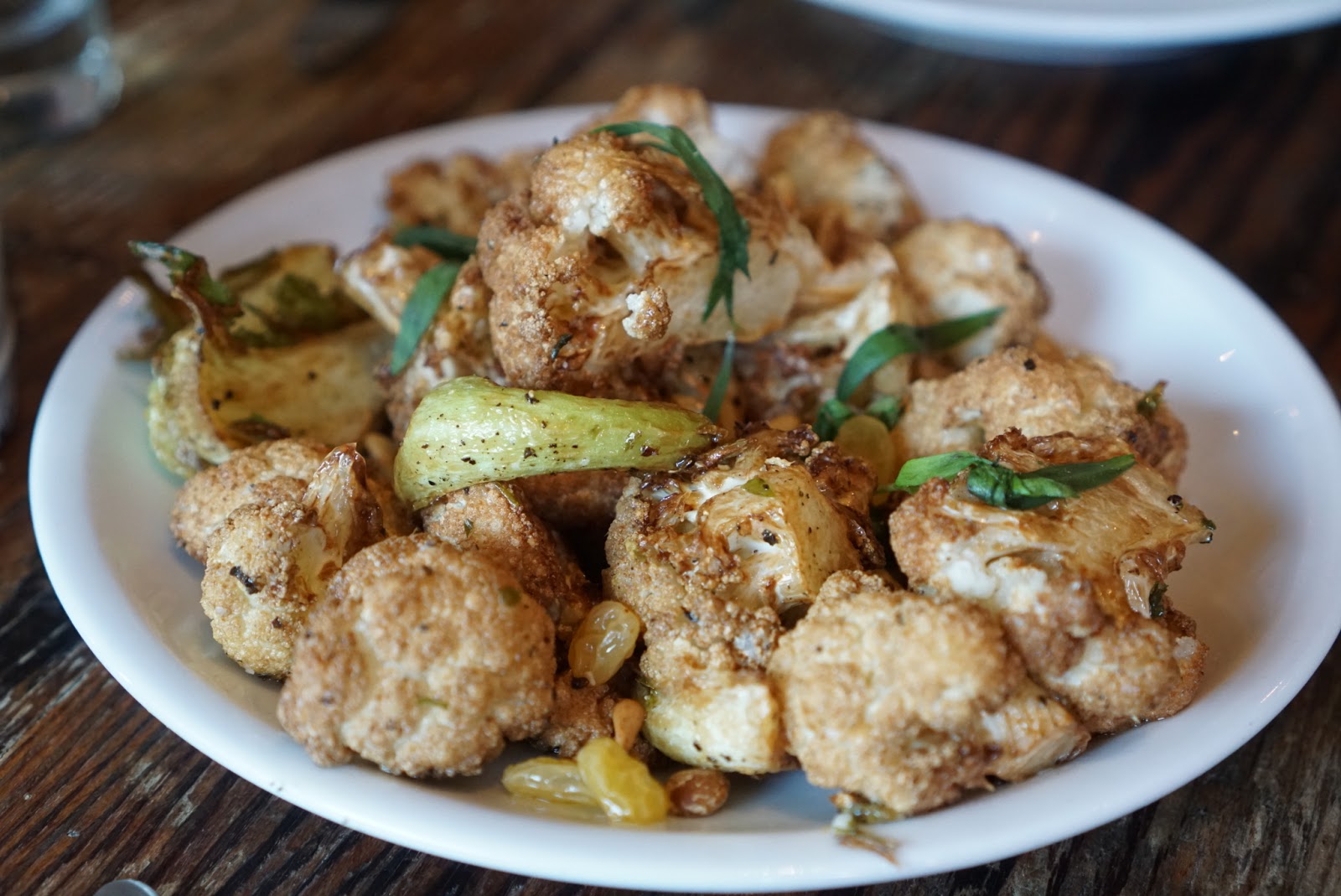 If you’re going to fry a vegetable, your best bet is to fry cauliflower or Brussels sprouts. Frying brings a a golden caramelization while keeping the vegetable firm and crispy. There’s nothing worse than mushy vegetables. The raisins added some sweetness while the pinenuts added crunch. It was a good starter.