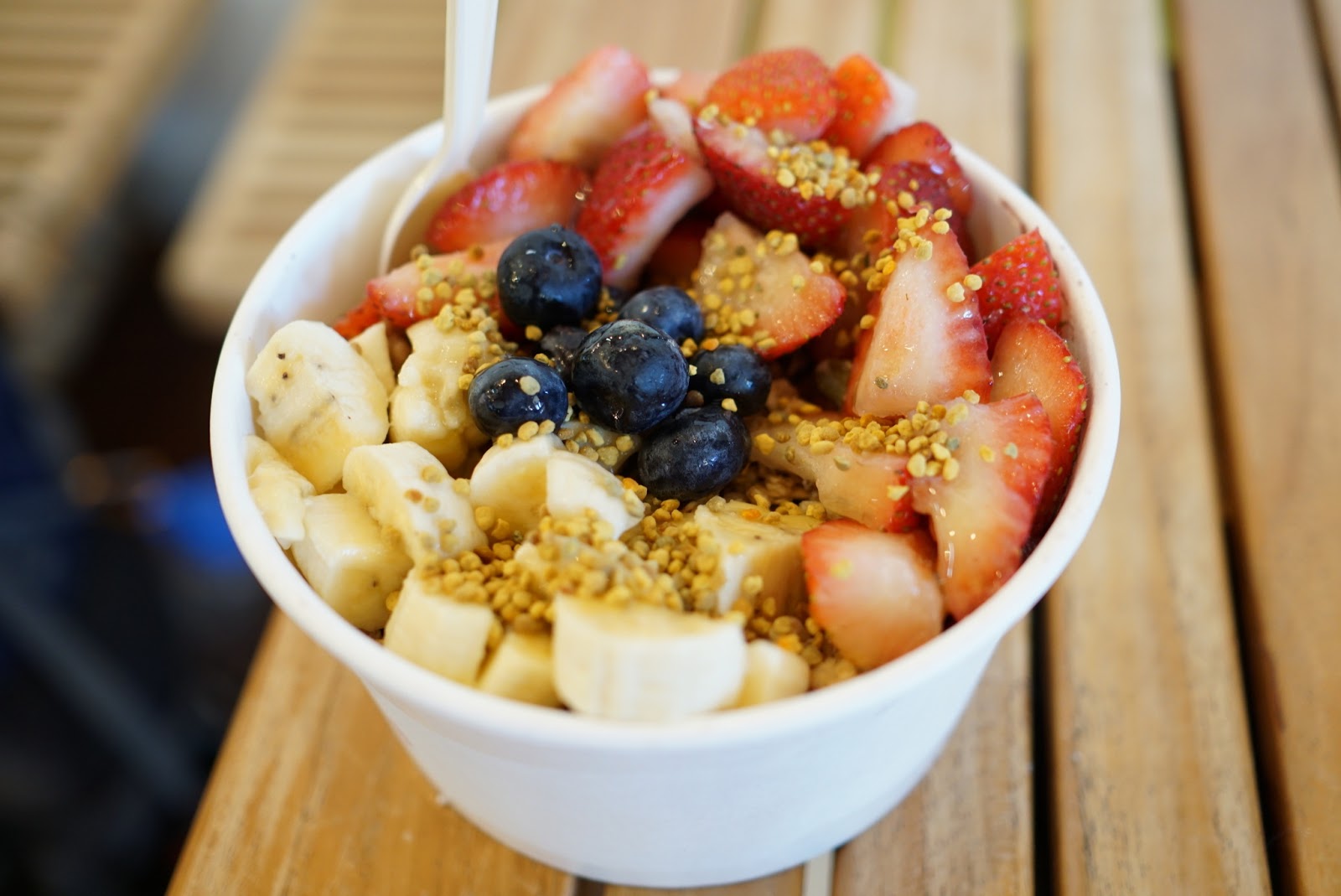 No Ka Oi Bowl organic granola, superfood acai, local apple banana, blueberries, sprouted raw almond milk, kula strawberries, bee pollen, hawaiian honey