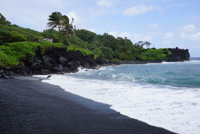 So if you’ve ever been to Maui, you’ve probably done the “Road to Hana” trip. It actually sounds much more glamorous than what it actually is, which is just a really long and windy drive around the north part of the island. You’re supposed to get off at various scenic points along the way to take in the natural beauty and wonder of Maui. The drive itself is only 2.5 hours but making multiple stops along the way can really drag out the trip. You also have to factor in the time it takes to drive that same road back before sunset to avoid a dangerous nighttime drive on a windy narrow road. It’s easily an all day affair. Knowing this, we tried to hustle and make only a few stops along the way, with the most time spent at the Waianapanapa Black Sand Beach.