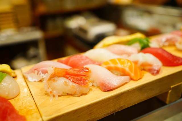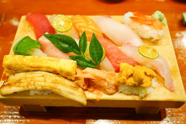 tuna, red snapper, salmon, yellowtail, sweet shrimp, opakapaka (pink snapper), big eye toro, flounder, blue fin toro, scallop, uni, anago, tamago