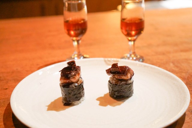 Foie Gras Nigiri balsamic chocolate kabayaki, raisin cocoa pulp, sip of aged sake