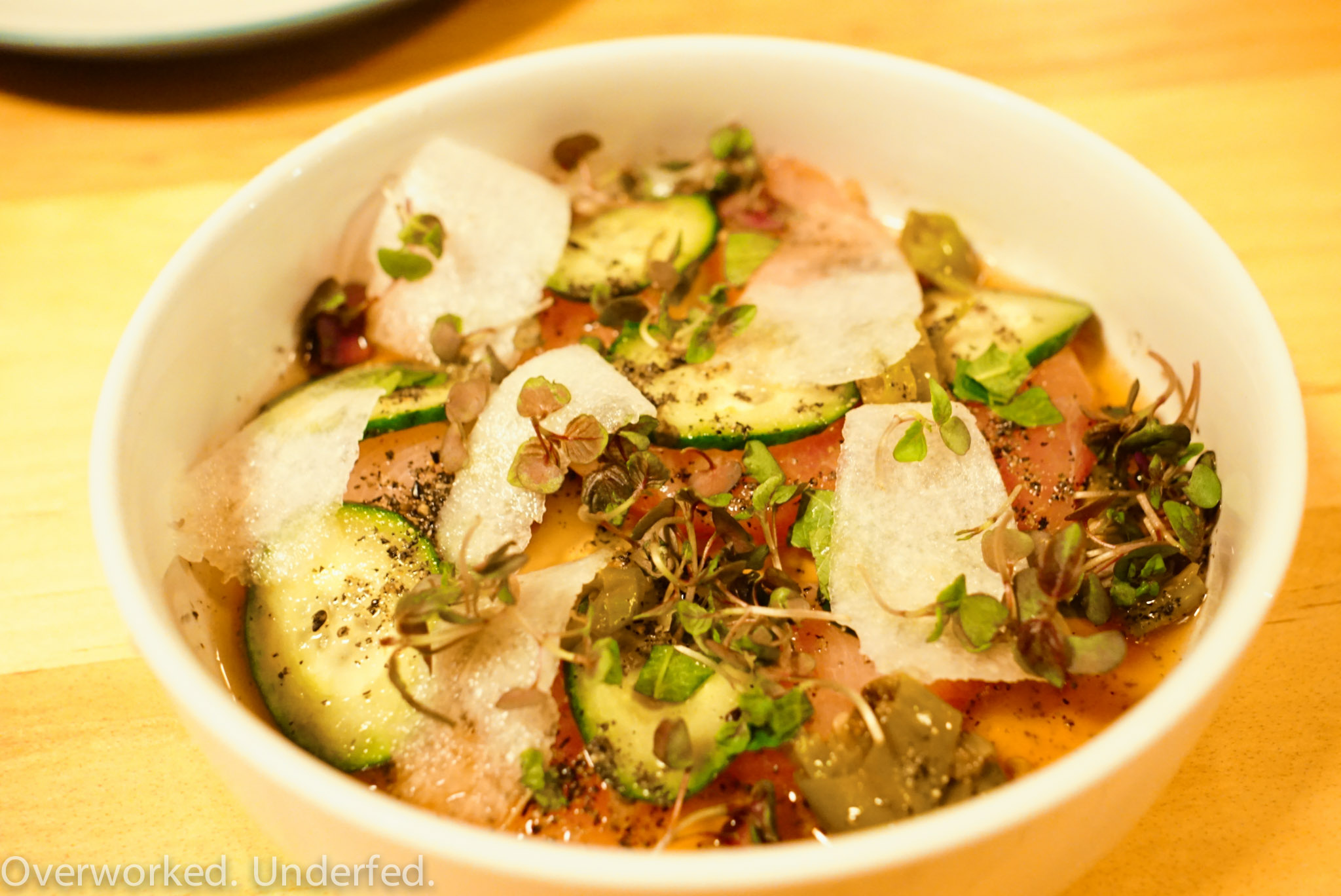 A light and cool start. The flavors and textures were all perfectly balanced. Tender slices of yellowtail against the sweet crunch of pears and cucumbers. It was dressed with a nice blend of salt, sweet, and acid.