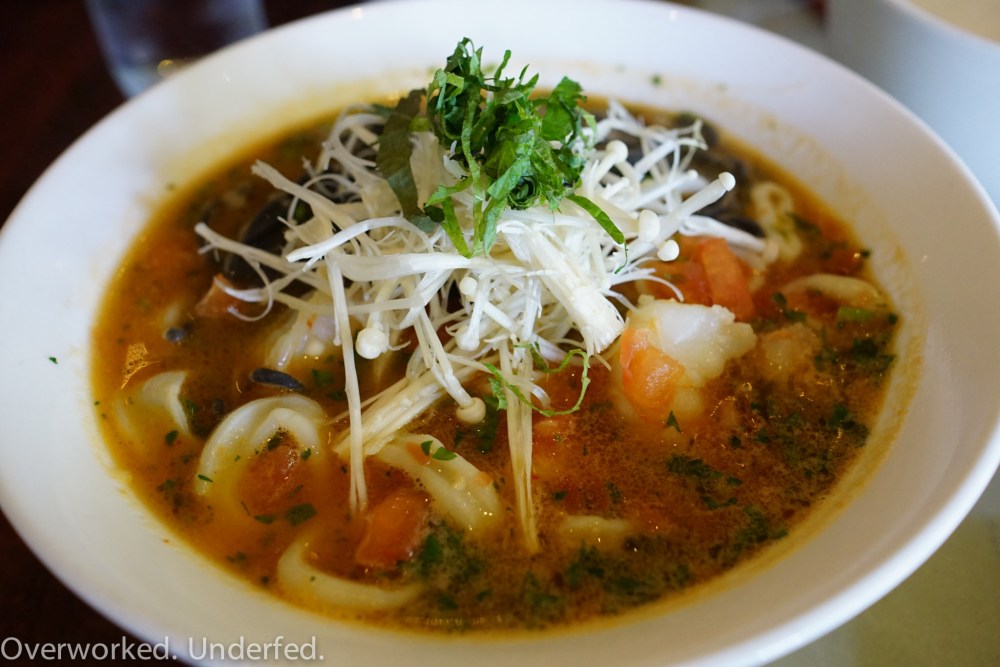 Squid Ink Spaghettini monterey squid, local white shrimp, garlic tomato compote, red curry, lemongrass dashi broth, seaweed butter, enoki mushrooms, shisoThe spaghettini BLEW MY MIND. It was frickin’ bomb dot com! I can’t even begin to describe the flavors going on here. There was a certaini umaminess that incredibly delightful. I kept wanting more and more of the tangy, sweet, savory broth. I could taste hints of seafood from the dashi, a bit of tang from the lemongrass, and some spice probably from the red curry. I have never had anything like. The noodles and plentiful seafood were awesome bonuses, but that broth should win an award of some sort. So beyond YUMS!!!!!!!